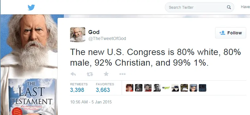 The new U.S. Congress is 80% white, 80% male, 92% Christian, and 99% 1%.