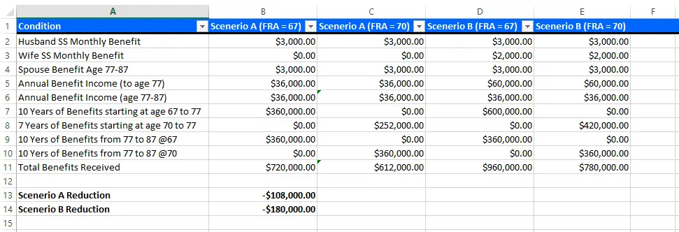 Scenario A (FRA = 67) [Column B] establishes the baseline for "A". The husband is the only one drawing SS benefits and when he passed at 77, the wife is eligible to draw at his rate for the remainder of her life for old age support. Total benefit draw here is over a period of 20 years.