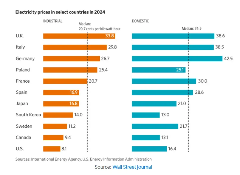The average cost of electricity in the U.S. is approximately 16.68 cents per kilowatt-hour (kWh) as of March 2024 and is projected to rise to 17.11 cents/kWh by March 2025. Additionally, the average retail price for households reached around 16.48 cents per kWh in 2024.