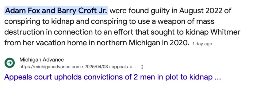 Z99 Platinum Member Joined Aug 30, 2024 Messages 685 Reaction score 584 Points 888 Apr 4, 2025 Thread starter Banned #6 MarathonMike said: This smelled like another Democrat Dookie from the get go. "Conspiring to use a weapon of mass destruction planning to kidnap Whitmer". LOL Click to expand... Yea it stunk to high-Heaven from day one. Kidnapping a governor? Riiiight.