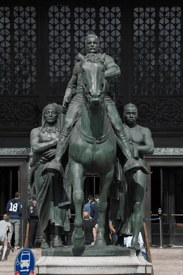 The statue shows him seated on a horse while a Native American and an African stand suberviently below him. It's a celebration of imperialism at it's worst. The Museum said they still honor Teddy as a pioneering conservationist.