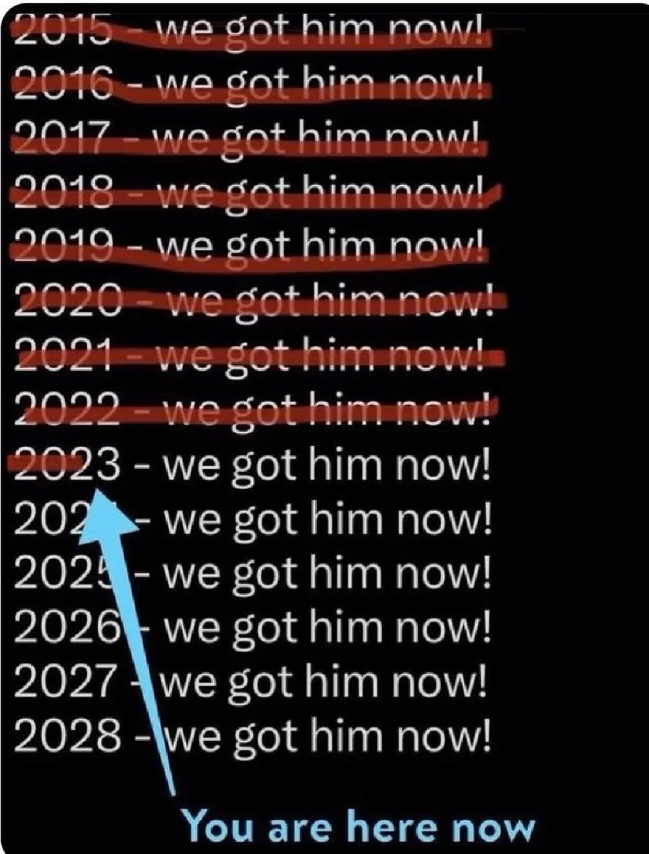/——-/ When are you going to plead guilty?After examining the indictment with an eye towards doing what's best for the client any experienced defense attorney in any other case would advise his/her client to seek a plea agreement. Cuz wow, WOW, the indictment includes Don confessing to one of the crimes charged against him. The evidence compiled in the document released yesterday is stunning in its level of detail. He's toast, unless his toady throws out the evidence.