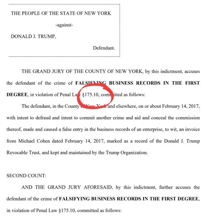 TRUMP is charged in a New York State Supreme Court indictment with 34 counts of Falsifying Business Records in the First Degree.[] *