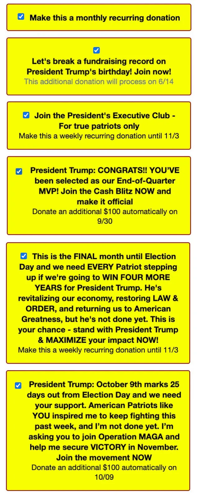 A New York Times investigation found Trump's fundraising campaign employed deceptive fundraising tactics that saw thousands of his supporters unwittingly sign up to give repeat contributions, when they had only intended to make a one-off payment.