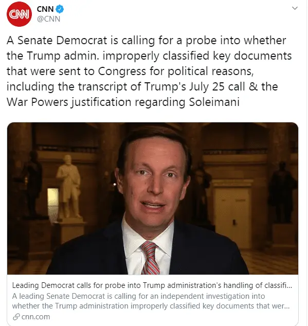 A Senate Democrat is calling for a probe into whether the Trump admin. improperly classified key documents that were sent to Congress for political reasons, including the transcript of Trump's July 25 call & the War Powers justification regarding Soleimani