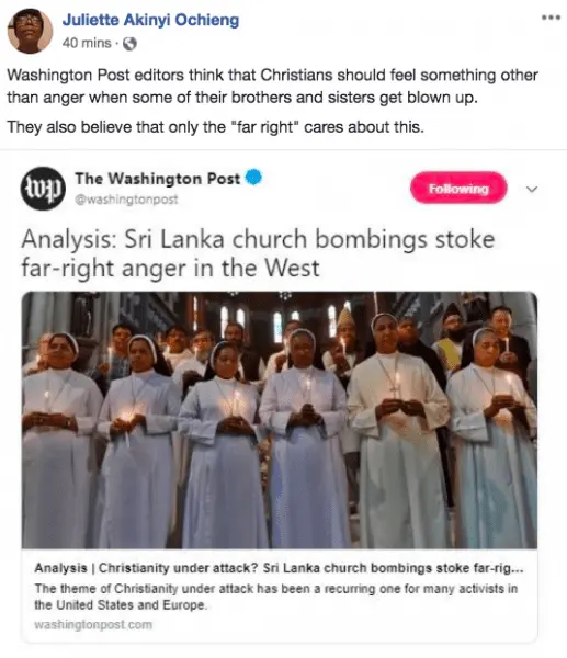 No need to worry, they were just Christians. You know, the 290 Christians who died in the bombings in Sri Lanka? Yeah, no big deal. Not my problem. Muslims have more right to worship their faith than do bigoted Christians. We should be more kind and compassionate to worshipers of Islam due to their inclusivity...