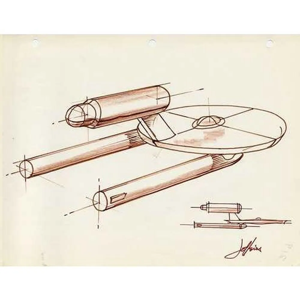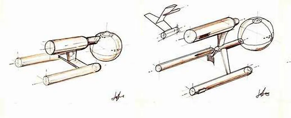 Jeffries didn't design the Enterprise, he produced HUNDREDS of drawings which Gene went through and slowly took a bit of this one or that he liked, going back to the drawing-board again and again until they got closer and closer to the look and design that Roddenberry was searching for in his guts, and when he finally saw what he was looking for, he knew it. Where Jeffries really sailed, was on much of the interior set designs where he came up with the bridge layout, so good that the Navy borrowed the idea and built some ship control layouts based on a similar concept, just as medical experts demanded to know where he got the idea for the medical bed scanners, as they were working along the same ideas. And the Enterprise design continued to evolve and be fleshed out further in smaller details through the 3rd season as budgets allowed. There had been thought to making the back of the engines do a little optical effect as the front but they simply ran out of money.
