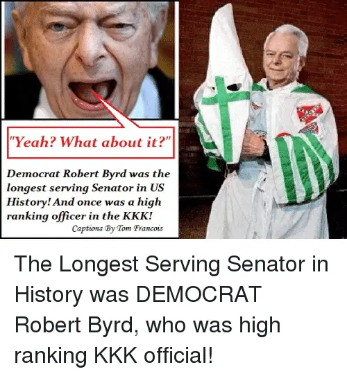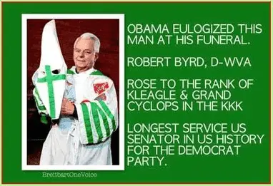 1- Democrat leaders cajoling and then weeping for ex KKK leader Robert Byrd, the longest serving Democrat senator.