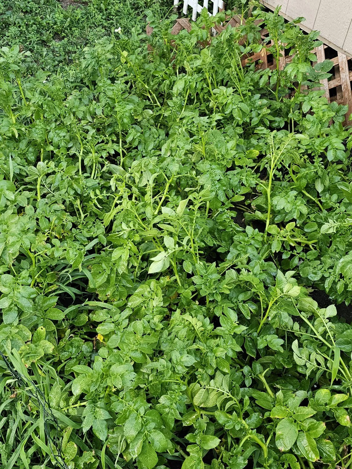 If you beat them with a rake, they will behave.The potatoes have taken over the entire back half of my garden.