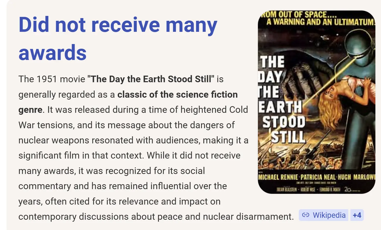 The day the Earth stood still. Who saw it? At the time, it was stunning. Michael Rennie stared and we did not know him.