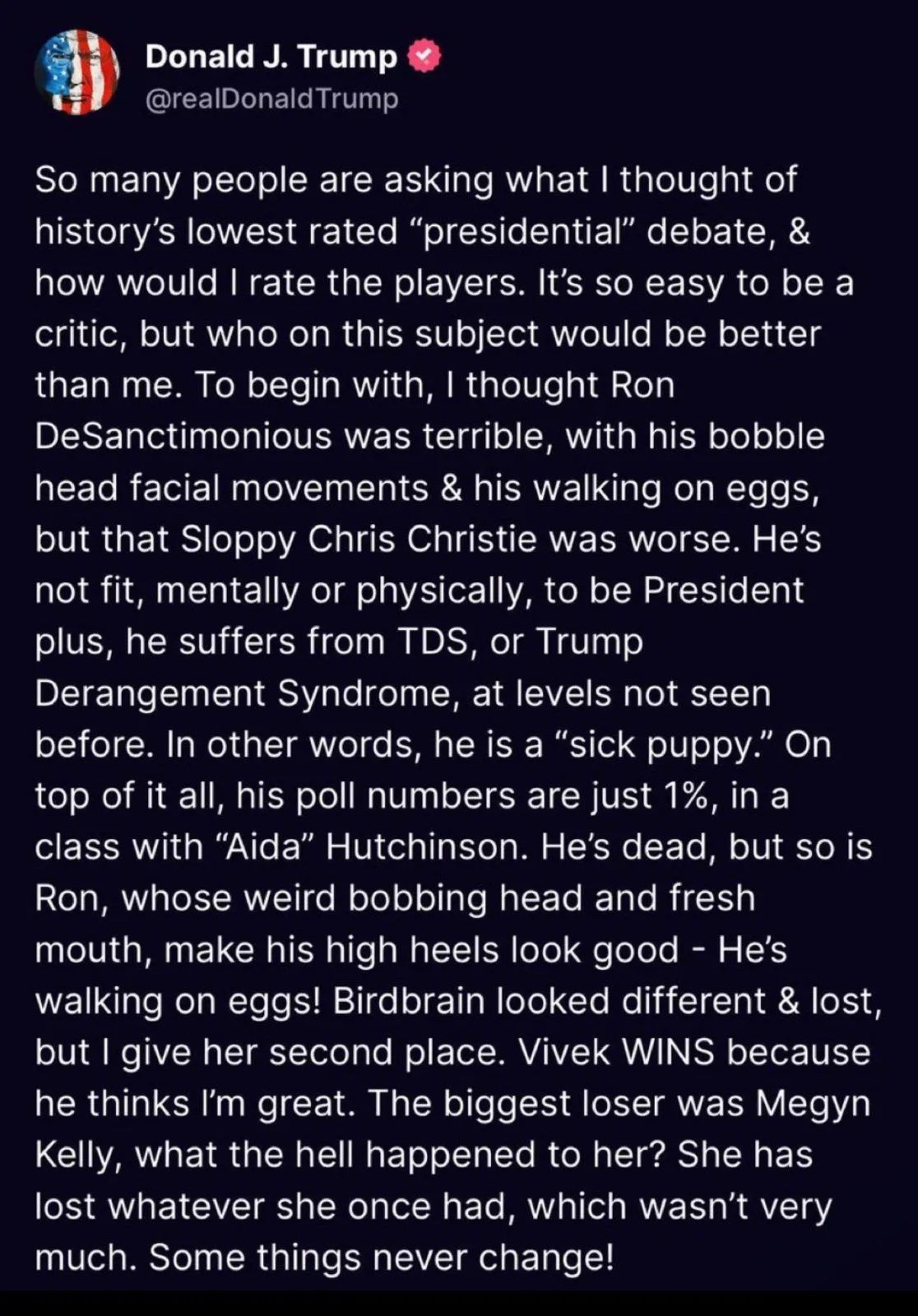 I can't think of another presidential candidate in American history, or any other country, really, who takes to the media and engages in taunting and name calling of his opponents resembling that of a 12 year old. In fact, even a 12 year old would likely come up with more sophisticated insults. This man does not belong in the White House. He's completely unhinged and an embarrassment.