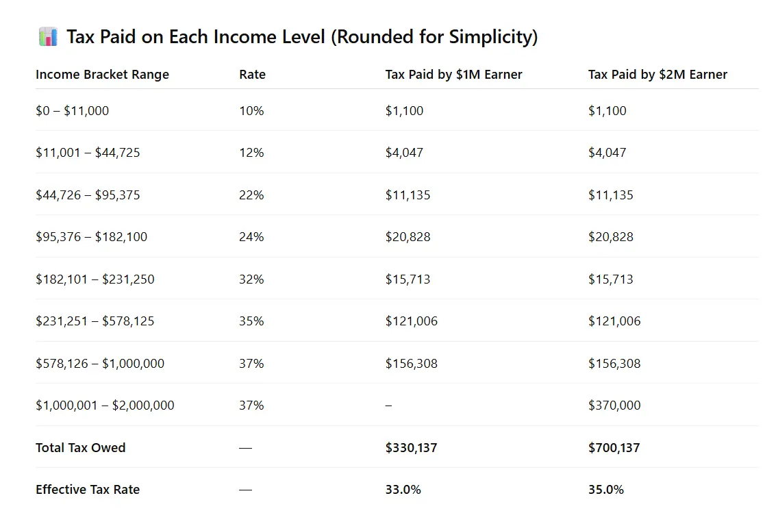Notice that by the bottom and at the far right it shows the $2 million pay $370,000 at the 37% (which is where the tax brackets currently top out) versus the $156,308 paid by the $1 million, at the same rate, 37%.They dont. Follow this chart and see that we all pay the SAME IN TAXES. NO ONE pays more than anyone else in taxes.