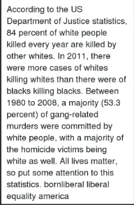 These facts show the utter nonsense racist whites share relative to the issue of black-on-black crime. This information kills the claim by the racist subculture that blacks don’t take responsibility for crime due to the arduous work of unknown, not-so-famous blacks toiling in obscurity in cities/towns all over this country. These are the stories that rarely get told by the media.