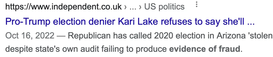 Again... why is it so difficult to provide links to show the sources of your subjective, personalized and grossly uninformed statements???Are you seriously going to compare the efforts by Trump (supported by Kari Lake) to overturn the election?