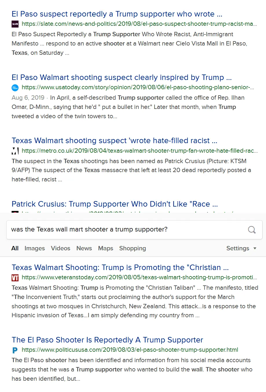 Maybe, but I just did a search just now with the search argument Was the Texas Wall Mart Shooter a trump supporter? This is what it returned 5 minutes ago, so I am not the only one with this impression.