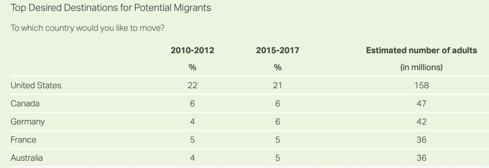 Fifteen percent of the world's adults -- or more than 750 million people -- say they would like to move to another country if they had the opportunity. This is up from previous years, but still shy of the record high of 16% set between 2007 and 2009.news.gallup.com