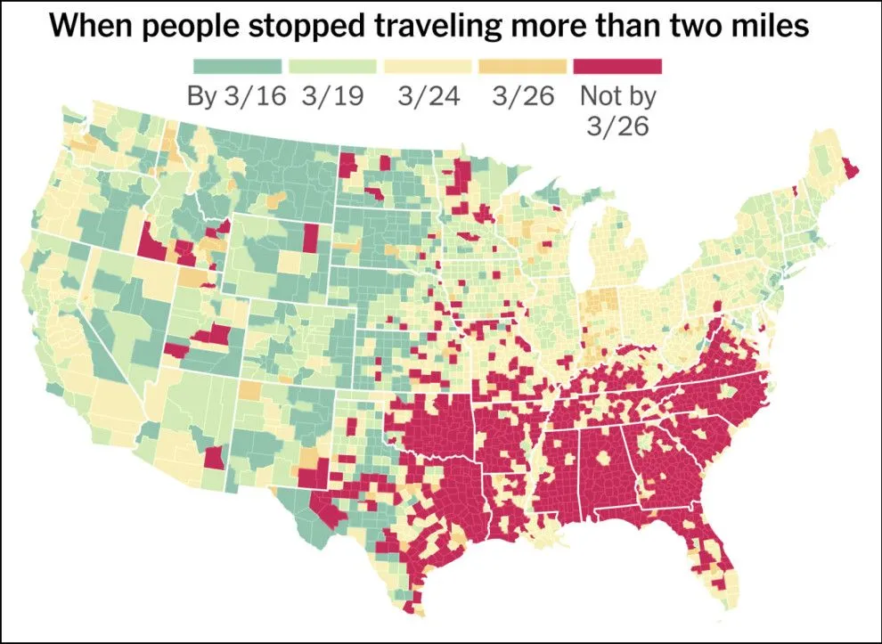 This map, published in the New York Times shows areas of the nation where Americans are staying at home as medical and scientific experts advise. Also shown, are the states where people are not staying home, and are primarily in the Southeast.