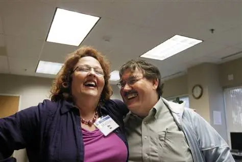 Marilyn Robach and Joel Brever share a moment in the Work Force Center in Blaine, Minn. Robach will join the others in unemployment at the end of the month because her job was funded by the stimulus package. Brever who lost his job recently updated his skills by studying to be residential energy auditor.
