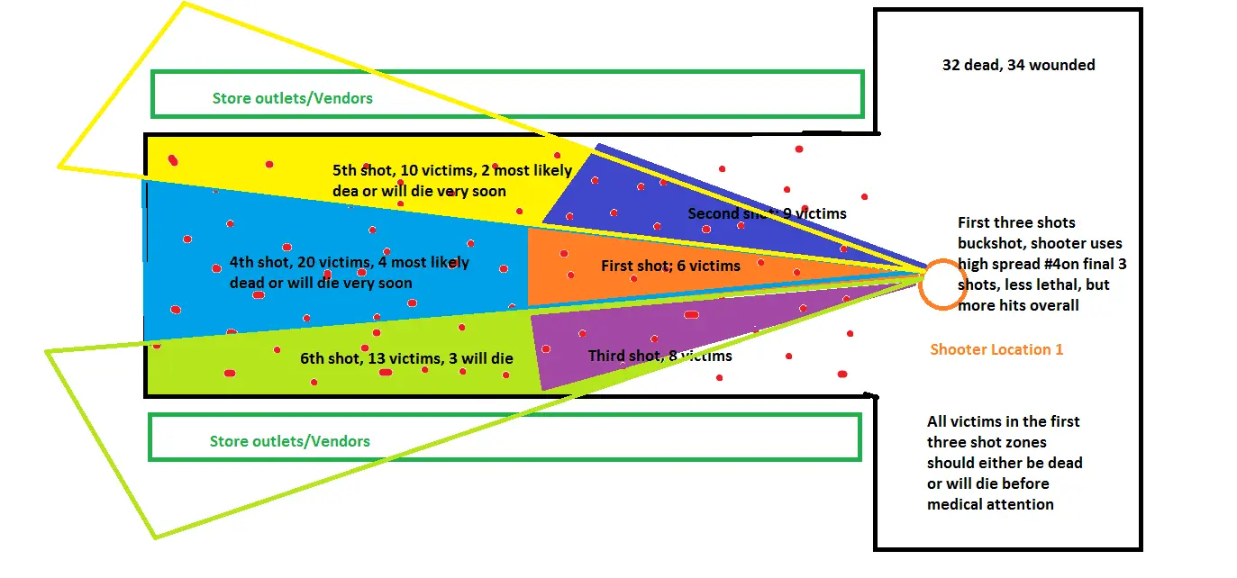 6 shot12 guage shotgun shooting 00 buckshot =15 30 cal balls per shot how could anyone not hit a human shot at??