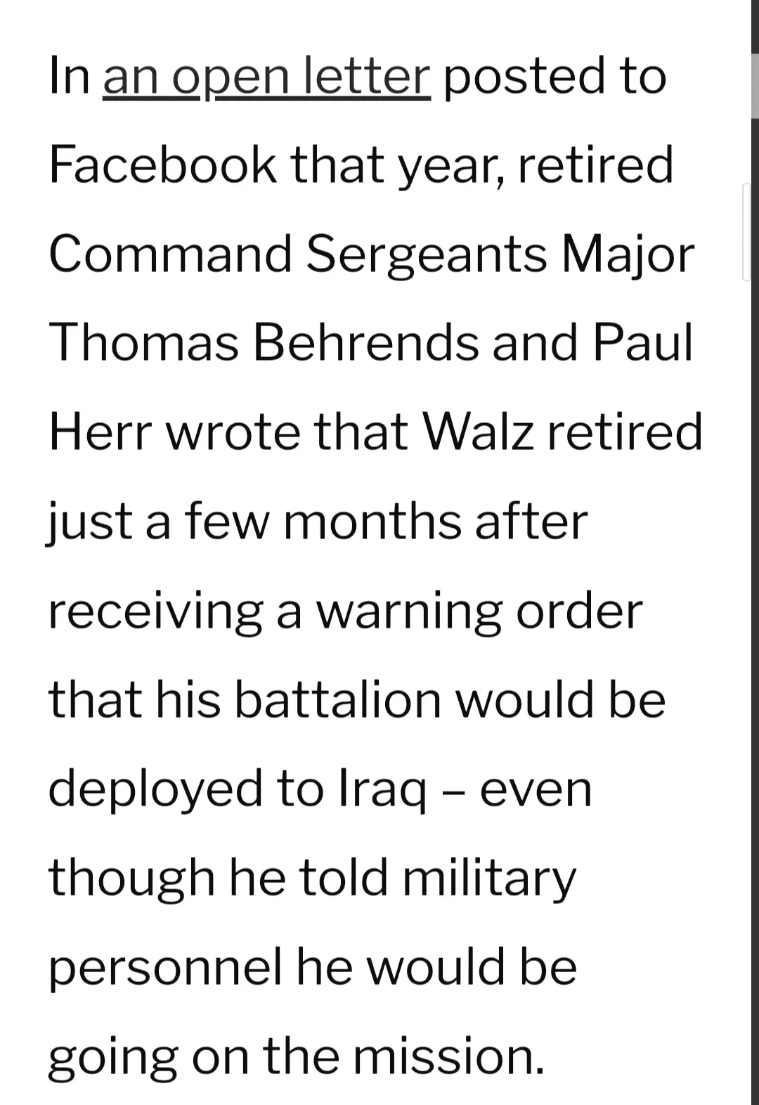 “On May 16th, 2005, [Walz] quit, betraying his country, leaving the 1-125th Field Artillery Battalion and its Soldiers hanging without its senior Non-Commissioned Officer, as the battalion prepared for war,” Behrends and fellow retired Guardsman Paul Herr wrote in a letter posted to Facebook during Walz’s first gubernatorial run, in 2018.