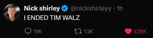Too bad he did not have the foresight to step down as the VP for Kamala as well, which also helped drag her down. But, it was not all Tim's fault, it was the lack of judgement of Harris and the DNC to pick him as their VP.