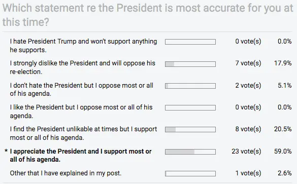 Trump wins again with an 80% overall popularity rating of either liking the president or at least supporting what he brings to the table vs. 20% who don't.