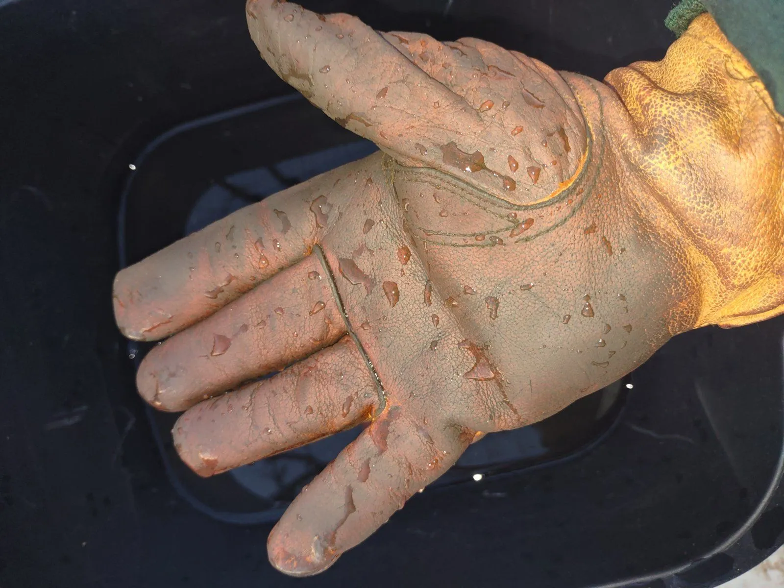 Coat the gloves up good with oil paying special attention to the seams.