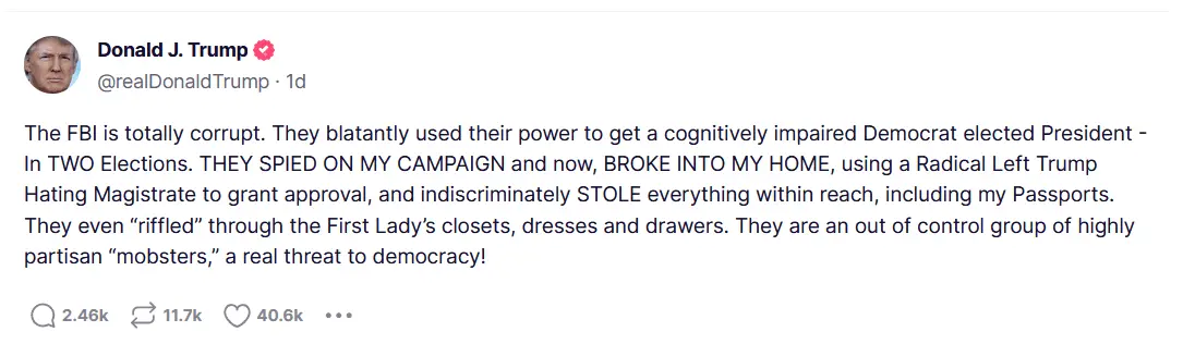 PS: He notes that Barron Trump's room was searched by the FBI during the raid. He sounds rightly ticked off.