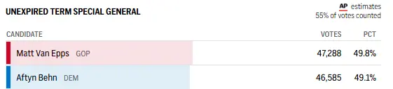 59% of the vote reported and Aftyn Behn is only trailing Van Epps by 300 votes. This is a solid red District that Trump won by over 20 percentage points and Behn is a far left extremist. Even if Van Epps wins this, this is a terrible result for the Republicans.