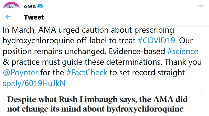 Limbaugh accused the AMA of "knowingly lying about hydroxychloroquine." But as the Poynter Institute reported, the AMA never retracted its statement on the drug. The Published Reporter and other websites that spread similar claims have walked back their reports, and the AMA addressed the matter on Twitter.