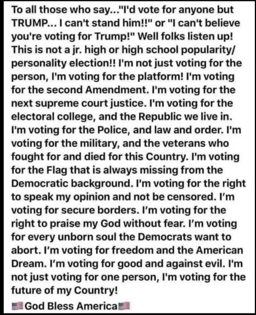 That is all she posted, so now you get your chance to say why you voted for Trump. Will you also vote for Vance? To gather more of you, who is top of your list to vote for the next president?