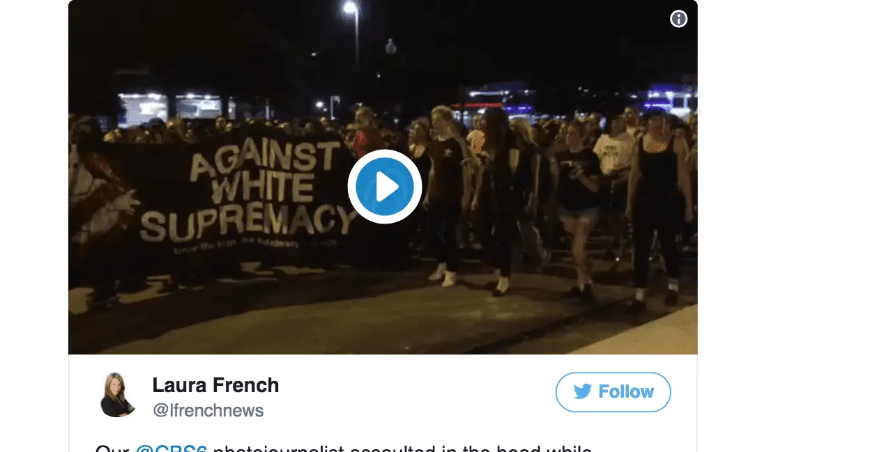 A WTVR CBS 6 journalist was assaulted and hospitalized by leftist, “anti-nazi and white supremacist” protesters on Sunday night.