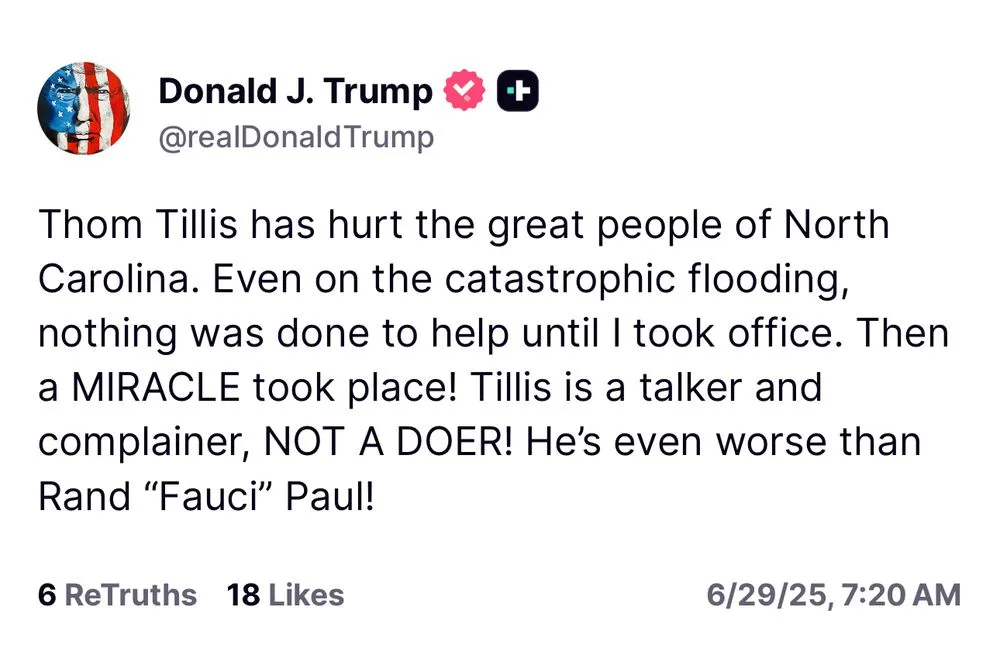 Blaming the media when Trump is already bullying Tillis on social media for refusing to support this total bullshit bill.Well those cognitively challenged due to brainwashing, ideological manipulation, hyper partisanship or whatever, probably don't recognize dementia when they see it up close and personal, much less when manipulated by a dishonest media. That goes doubly for those so intellectually dishonest they believe that dishonest media rather than what they own common sense tells them..