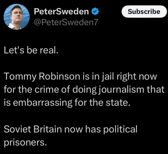 I've seen video of Robinson being arrested and pepper sprayed for eating breakfast. The UK police state under Starmer is out of control.
