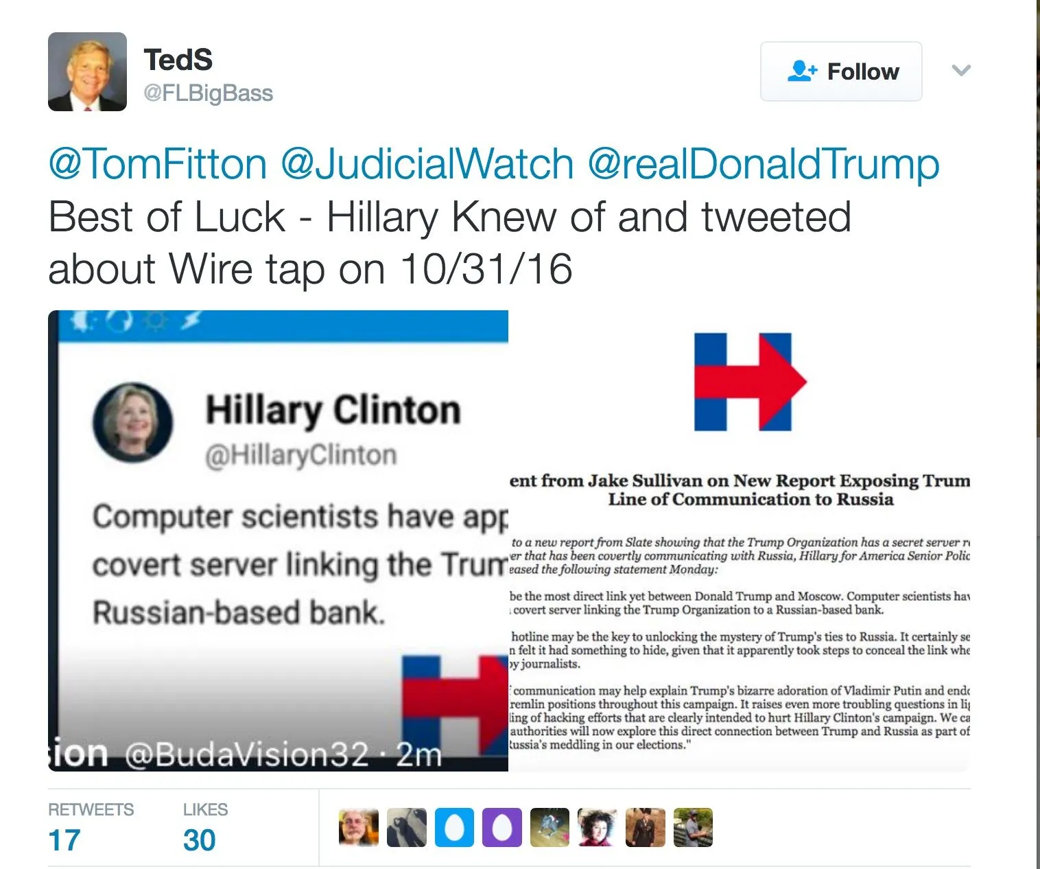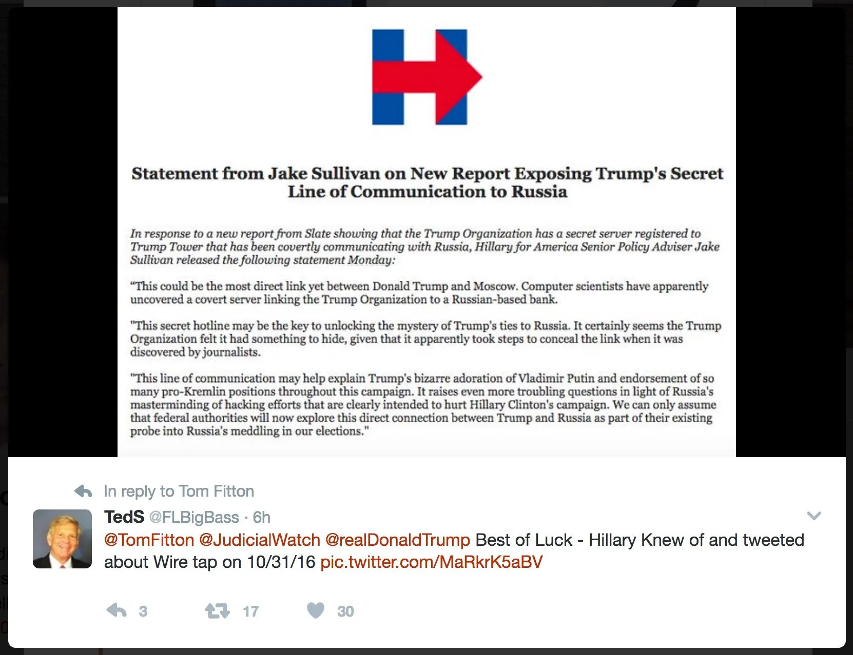 4. October: FISA request. The Obama administration submits a new, narrow request to the FISA court, now focused on a computer server in Trump Tower suspected of links to Russian banks. No evidence is found — but the wiretaps continue, ostensibly for national security reasons, Andrew McCarthy at National Review later notes. The Obama administration is now monitoring an opposing presidential campaign using the high-tech surveillance powers of the federal intelligence services.