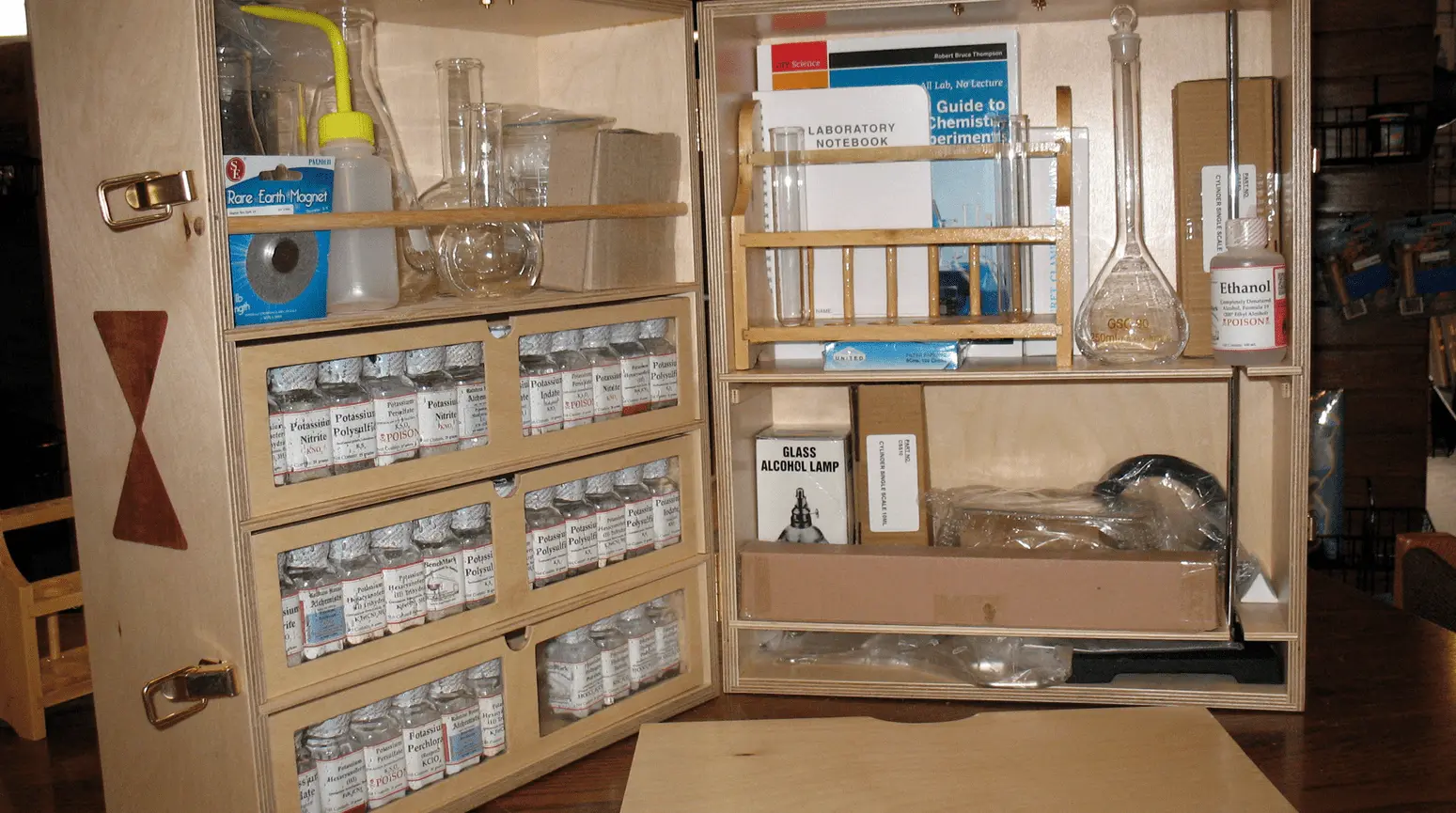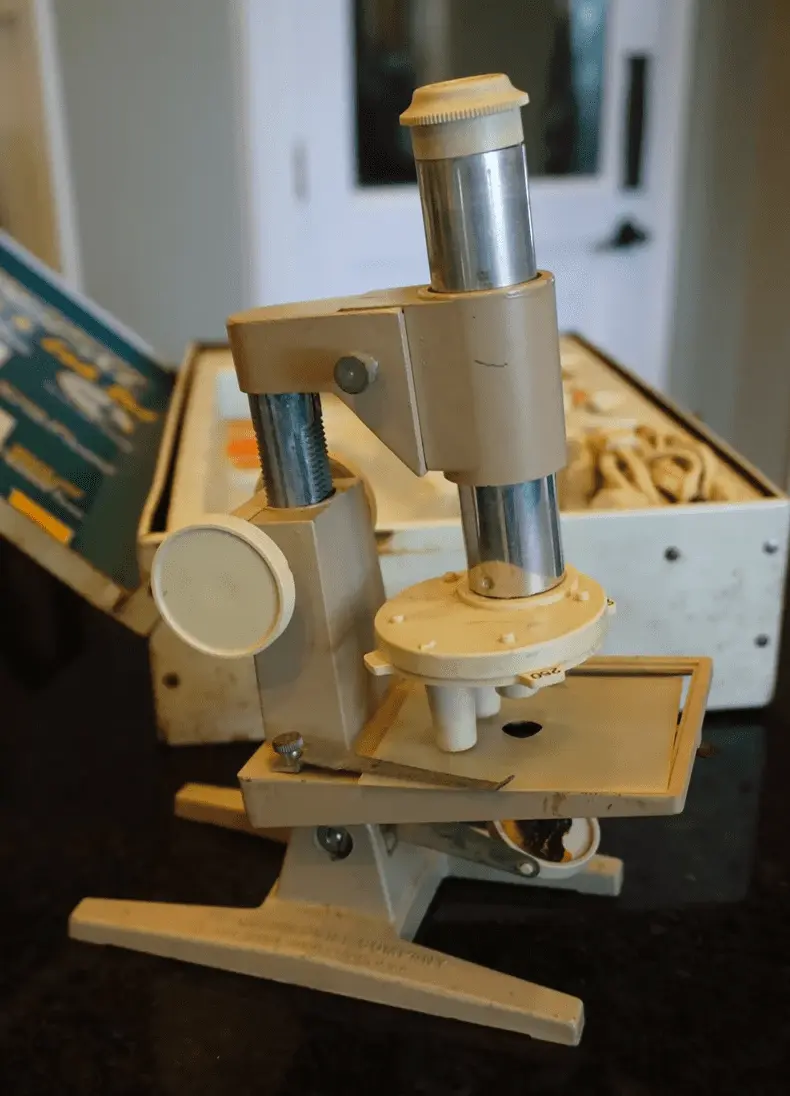I added to it all kinds of other stuff not seen here, beakers, flasks, tubing, bunsen burnerr, all of course freely available right at my local drug store. I also had a Gilbert microscope which I still have and years ago added a stereo head to it and adapted it to use quality eyepieces. It actually is pretty effective.