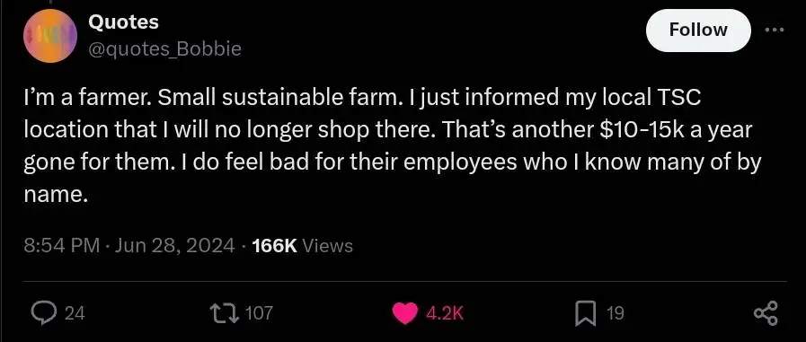 They should have stayed out of the culture war to begin with.Apparently, TS wasn't making the money to pay their CEO the $30M he's making this year just on selling hay to farmers, so they hatched the plan to open a bunch of stores in suburban areas. To go after the people who want a wide variety of dog foods. To go after the people with large properties in nice neighborhoods.