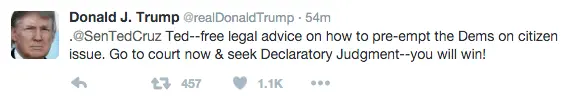 A man is innocent until proven guilty, rightwinger. Ted Cruz is an American citizen, until it is proven he isn't, and this issue died and went to heaven 3 years ago. Don't you recall the outcome? It's best in this shortened quote:care to elaborate? I'm ignorant on what it is and how one could win or lose the judgement. TIACruz won't do it because he knows he can't win that declaratory judgement