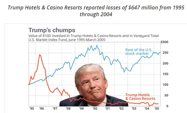 As Trump said... These were Big Boys and Girls... they knew the risks. He didn't file bankruptcy... he has NEVER filed personal bankruptcy, despite what his attackers claim. He was smart enough to get out before it tanked... others weren't. That's not Trump's fault.