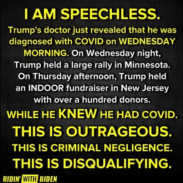 Yes he can but cowardly he didn’t because of incompetent and ineptness.The President cannot mandate the wearing of garb. If he did that you guys would be accusing him of being a tyrant. Grow up.I guess you haven't seen the ads and signs, "I wear a mask for you". Another failure of the Trump administration is not creating a nationwide advertising campaign for mask wearing and social distancing. Of course that would be rather hypocritical when the president is mocking and downplaying it.There is no need to "sell it" Marty, it's actually FACT BASED....I m not looking for zero risk.okOf course it can be controlled and reduced in spread.All Biden needs to do is touch the surface where the virus is and then touch his face by putting on or taking off his mask and he has got it... Shit happens... and there isn't anything anyone can do about it unless you live in a sterile bubble..God will see to it that biden gets it.Biden was in close proximity for 90 minuets.... He gets a test too...Convenient timing after that side show they called a debate the other night. Guess they really really really didn't want to debate again. Ha. I'm sure Biden is just as pleased.