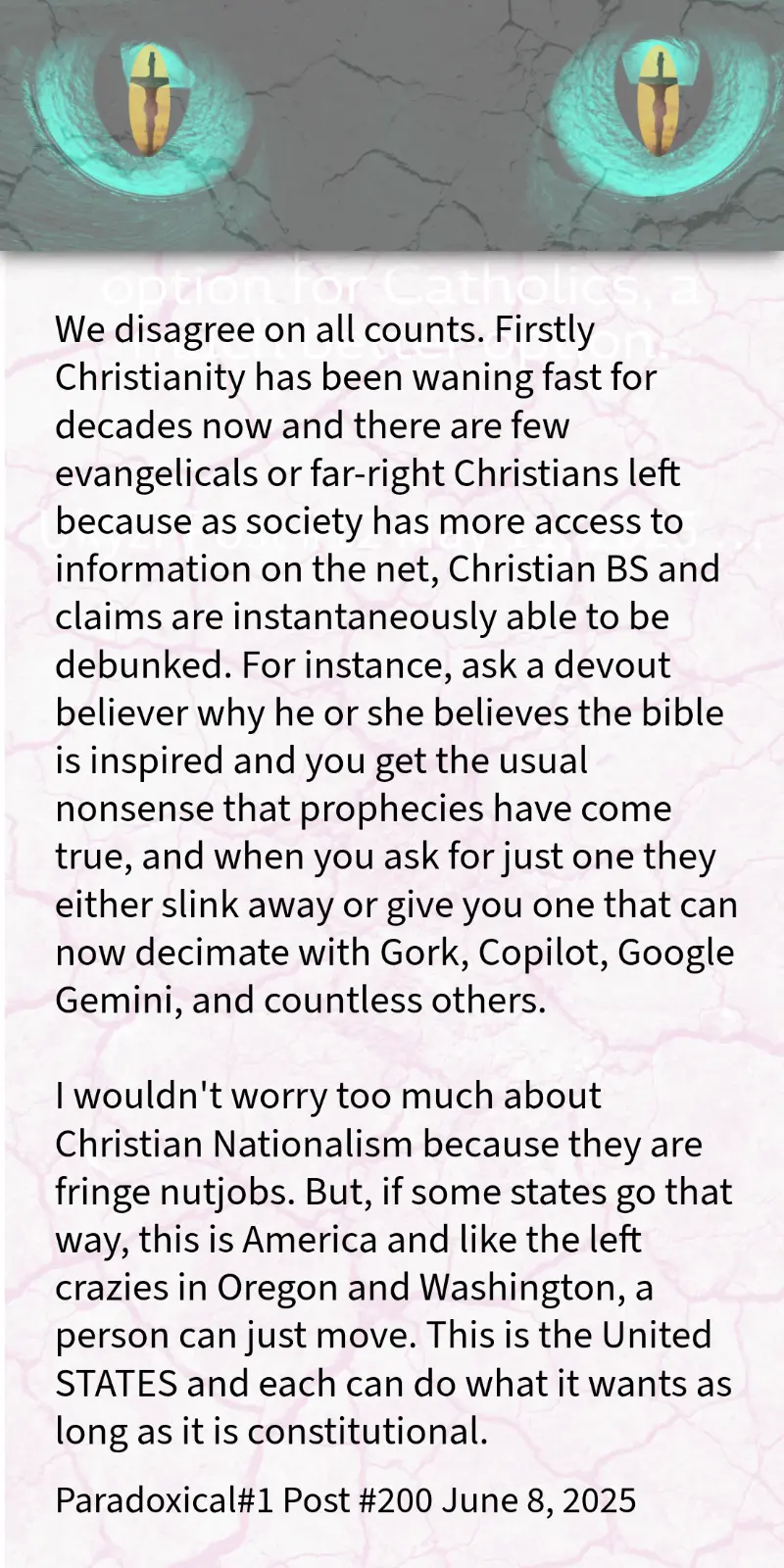 This is the diversion that religious nutjobs use. “Oh, you don’t want crazy ass teachings of blood sacrifices and hell because you Hyou don’t like freedom.” Get outta here with that bullshit.