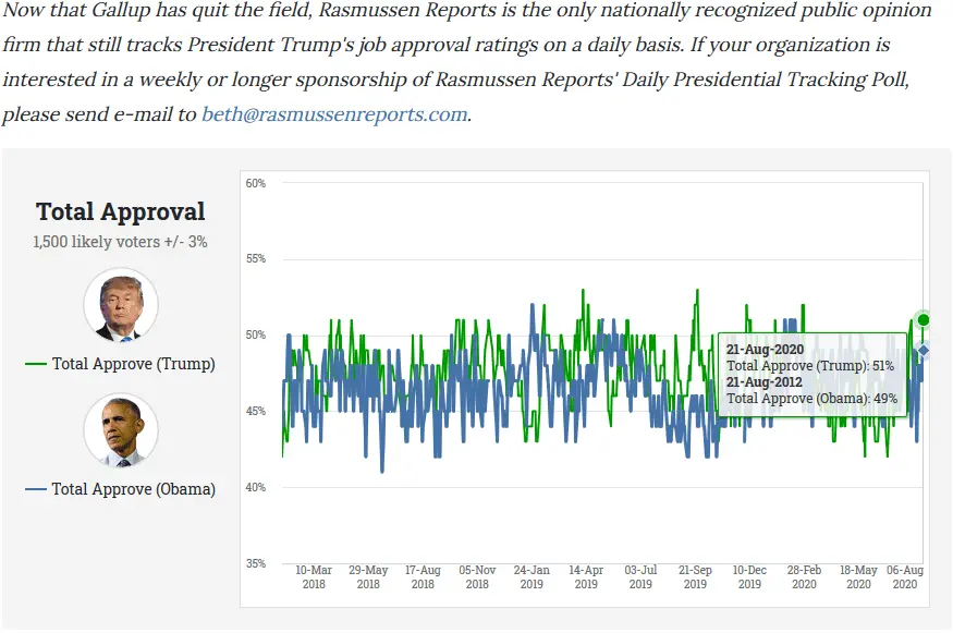 Three days of the Democrat/Bolshevik Convention has run The Donald up to 51%!! Ahead, by the way of what Iran-Lover Barack Obama was scoring at the same time in his presidency.