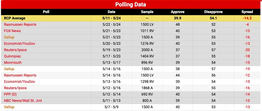RealClearPolitics - Election Other - President Trump Job Approval/---- Again, post the demographics of your polls before posting them unless you're hiding something.Glad to see you like polls again. 6 new polls were released since Tuesday. 5 of them show Trump's approval is at 39% on average with the high being at 40%. The lowest job approval rating for any president ever recorded at this point in their presidency. Hell, even the Pope is miserable being with him.The Rasmussen Reports daily Presidential Tracking Poll for Wednesday shows that 48% of Likely U.S. Voters approve of President Trump’s job performance.