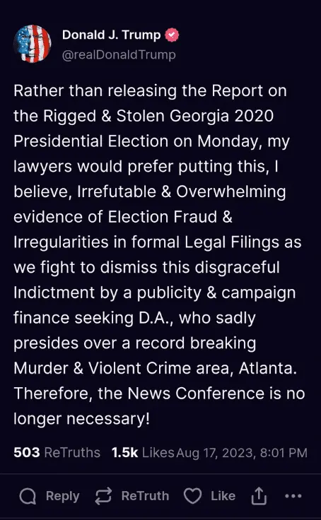 /----/ What's your point. It sounds like a better strategy.I'm sure CNN and MSNBC would have loved to carry the press conference Trump promised for Monday where he would present, once and for all, IRREFUTABLE & OVERWHELMING EVIDENCE that the election was stolen, leading to all charges dismissed and FULL EXONERATION.