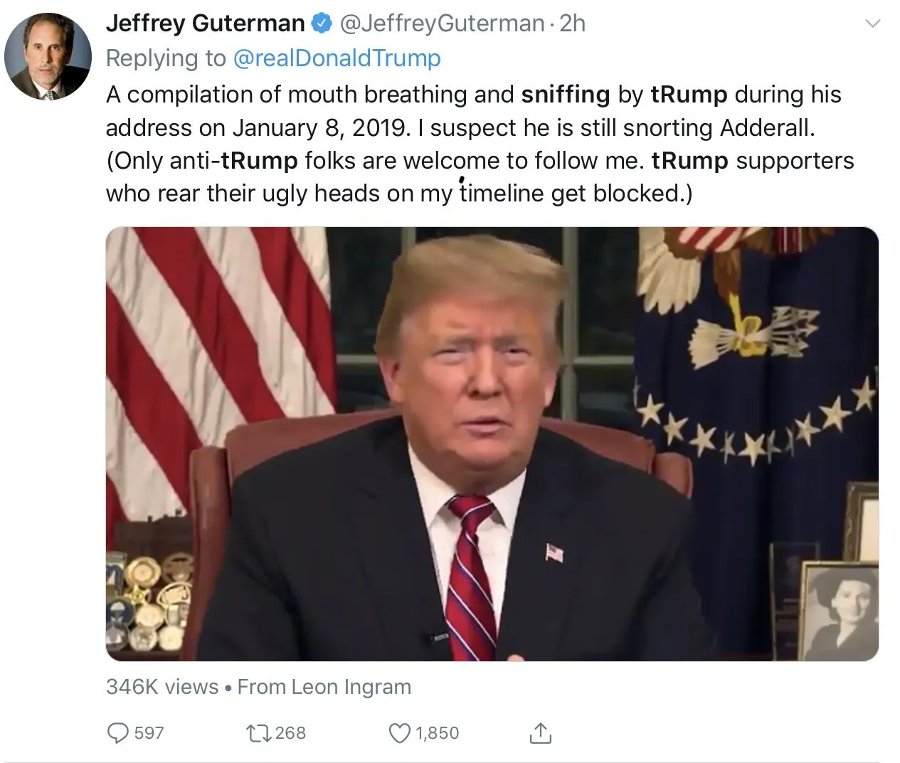 Too long; **** you.What President Trump in his national address tonight demonstrated with a titanic size flood light is that he screwed-up big-big-big-time, he committed the Grandfather of all screw-ups, in listening to the likes of Ann Coulter, Rush Limbaugh, Sean Hannity in backing out of the deal with the House and the Senate to sign the Continuing Resolution to keep the government open. He demonstrated tonight that he doesn't have the case to make all those millions of Americans directly and indirectly significantly hurt by the shutdown to go through the hardship they will go through to force Congress to fund his campaign promise of a wall. President Trump hasn't learned the lesson that Representative Steny Hoyer and Senator Dick Durbin told him loud and clearly in his immigration summit in the White House way back in January of 2018 when they said to the President when you're talking about all these things like more Judges, more detention facilities, more security measures, etc. to stop the illegal immigration through America's southern border "you're talking comprehensive immigration reform and if you want to negotiate legislation to reach this goal you have to be willing to provide legal status to a large portion of the eleven million undocumented immigrants currently in America". President Trump in his Address quite effectively articulated the harm coming from illegal immigration through America's southern border but he also articulated how clueless he is in knowing the political path to solving the problem. President Trump quite stupidly believes the American people were all born yesterday the American people have known the scope of this terrible "illegal immigration" wound on the body of America for the last twenty years were waiting for a President that has the leadership skills to create the complex and extensive legislative solution needed to solve this problem. In this Address President Trump showed he offers America no hope in solving this problem.