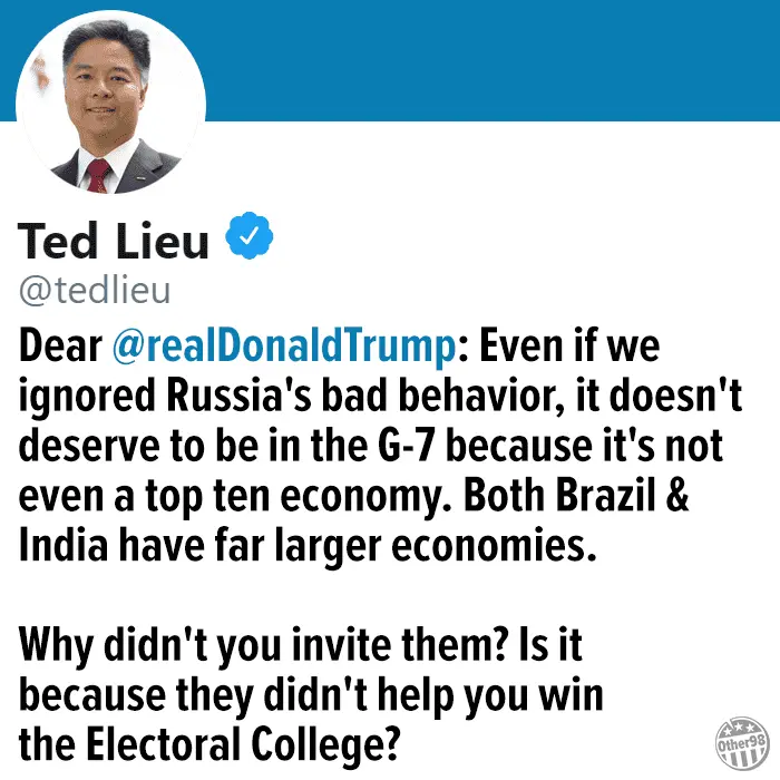 But it's irrelevant to the issue of the G-7. we don't get anything good from Russia. They never were our ally and never will be. They killed hundreds of Dutch citizens. They invaded Ukraine and are killing a dozen or so a week now. West Europe needs Russia. There are only two reasons Trump would bring up the G-7 and Europe. "shiny object" don't look at tariffs. OR, vlad told me to.