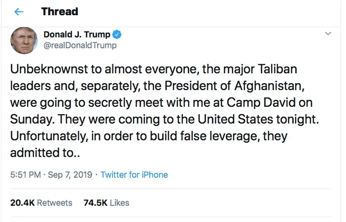 No it's not a negotiating tactic. The Taliban set off a car bomb killing 20 people, including a US soldier. The USA and the Taliban had basically wrapped up negotiations and agreed to a deal, and were in the process of bringing the Afghan President to Camp David to sign the agreement when this happened.