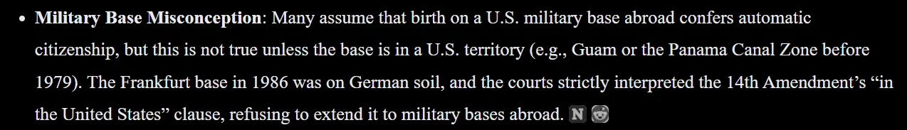 2) The military base on which he was born was not on US soil, and courts have interpreted the 14th Amendment to only apply on American soil.