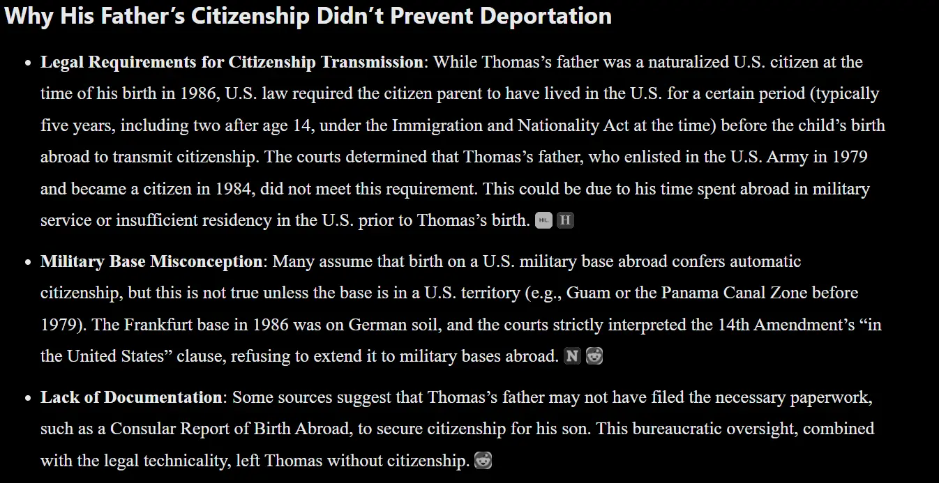 1) His father was not a US citizen for the requisite period prior to Thomas' birth.