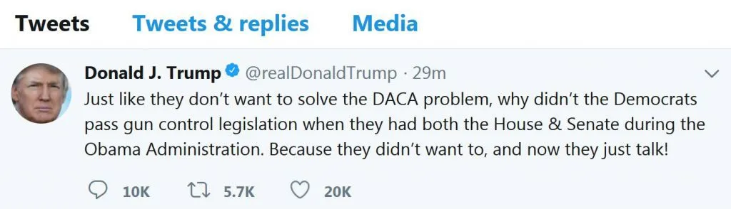 President Donald Trump took to Twitter Saturday to blame Democrats for failing to address gun control during the eight years President Obama was in office.